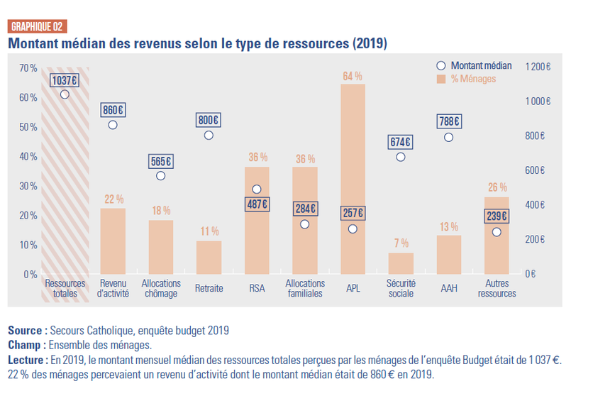 « Des choix impossibles. » Le titre de l’enquête menée par le Secours catholique sur le budget des ménages précaires en France donne le ton. Sur la base d’un échantillon de près de 3 000 relevés budgétaires collectés l’an passé dans 55 départements, l’association a tenté de savoir précisément quelles étaient les ressources et les dépenses des personnes qu’elle rencontre quotidiennement. Premier constat : le montant médian de ces ressources s’élève à 1 037 € pour l’ensemble des ménages de l’étude. « Ce sont les revenus d’activité actuelle (salaires ou revenus d’activité indépendantes) ou passée (retraites et allocations chômage) qui, lorsqu’ils sont perçus, génèrent les ressources les plus élevées, suivis des allocations liées à une incapacité totale ou partielle de travail (pension d’invalidité de la sécurité sociale ou AAH, allocation aux adultes handicapés) », détaille le Secours catholique, qui souligne que le niveau de vie des familles avec enfants est globalement moins élevé.
